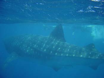 De volgende echt indrukwekkende stop was Coral Bay en Exmouth. Dit zijn 2 plaatsen die recht aan het Ningaloo Reef zitten. Een prachtig koraalrif dat zeker te vergelijken is met het Great Barrier Reef. Er gaan zelf verhalen dat in een paar jaar tijd Ningaloo het GBR gaat vervangen als beste duikplek in Oz. Het grote voordeel van Ningaloo is dat je gelijk van het strand af al in het rif zit, terwijl het GBR een stuk verder van de kust af ligt. JE loopt dus van het strand af en dan kun je gelijk de prachtige kleurijke vissen zien!! Echt heel gaaf! Exmouth is ook een prachtige plek om te duiken, maar er is daar een grotere attractie: Walvishaaien! van April tot ca september zwemmen er walvishaaien voor de kust en er zijn een aantal toeroperators die dagjes snorkelen met de walvishaaien aanbieden! Het heeft mij een rib uit mijn lijf gekost, maar ik heb het gedaan, samen met Coen, Marjolein en Lewis. De eerste keer, bij een test duik ben ik een Barracuda tegengekomen, dus op zich was dat al erg gaaf! Daarna zijn we naar het openwater gegaan en hebben we gesnorkeld met een walvishaai. Dat is echt geweldig! De vis in kwestie was zo'n 8-9 meter lang en ik kan je vertellen dat is echt heeeel groot!! Ik heb ook een DVD van de dag besteld en die ga ik naar huis sturen! Hier is alvast een voorproefje op de foto van hoe groot dat beest is!