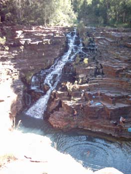 Na onze duik en snorkel avonturen hebbne we koers gezet naar Karijini NP. Een park wat meer landinwaards ligt en we hebben in het park 2 dagen doorgebracht. Het park staat bekend om prachtige gorges en watervallen. We hebben in het park een gorge wandeling gedaan en gezommen in de 'waterholes' die je daar kan vinden. Het is echt een prachtig NP en het is jammer dat ik niet mijn gewone foto's kan laten zien, want die zijn echt prachtig geworden. Op de foto staat Fortesque Falls, met ernaast de 1000 Steps een soort rostgebeuren. HEt is echt prachtig daar!!