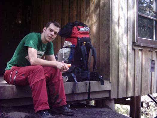 Hier zit ik bij de 2e hut op het pad uit te rusten. Ik heb hier niet overnacht, maar ben nog een hut doorgelopen