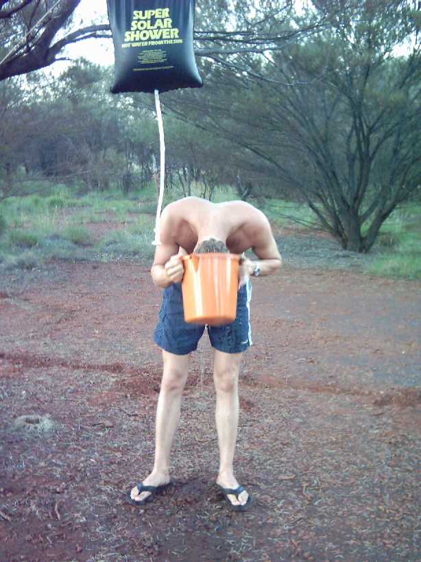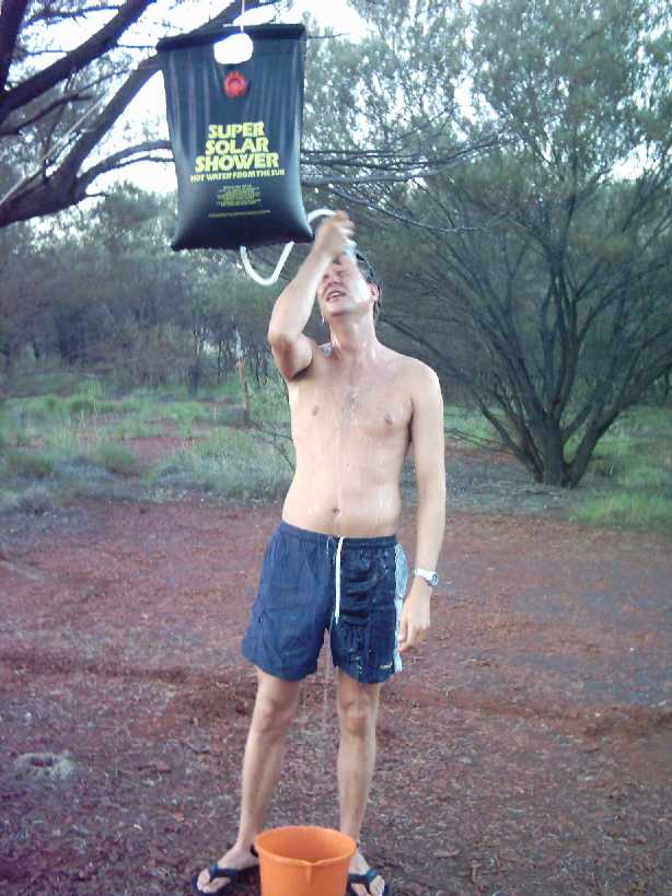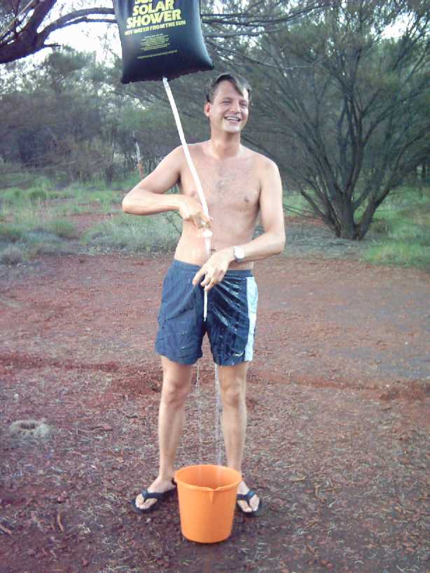 Hier een korte ompressie van hoe je moet douchen als je echt in de middle of nowhere zit! Heel eenvoudig. De volgende artikelen zijn nodig: 1. Een solar shower (zwarte waterzak met een douchekopje, vanb af nu bush-douche. zie foto), een boom om de busch-douche in te hangen, een emmer, een bepaalde hoeveelheid water en een Coen (in dit geval, anders kun je ook iemand anders gebruiken.) Het voorwerk is ook eenvoudig. Vul de bushdouche met water in de morgen en leg de zak op een plaats waar die vrijwel de hele dag in de zon ligt. Ga naar het strand, of snorkelen of wandelen en kom in de middag weer terug. Hang de bush-douche nu in de boom en haal je Coen erbij. Steek je hoofd in de emmer, de standaardmethode om je haar te wassen!