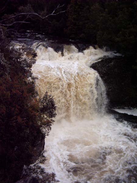Ik heb hier een mooie foto van Craddle Mountain NP. Het had de hele nacht geregent en daarom waren alle riviertjes en beken aangezwollen tot woeste stromen! Ik was erg blij dat ik mijn wandel schoenen bij mij had, want we zijn heel veel water tegen gekomen onder weg!! hier is een foto van de waterval die bij het visitor centre ligt!